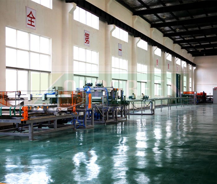 歐格XPS擠塑板生產(chǎn)線上的橫切機(jī)使用特種鋼制刀具將板材裁切成型,其裁切長(zhǎng)度可調(diào),以滿足板材型號(hào)需要。